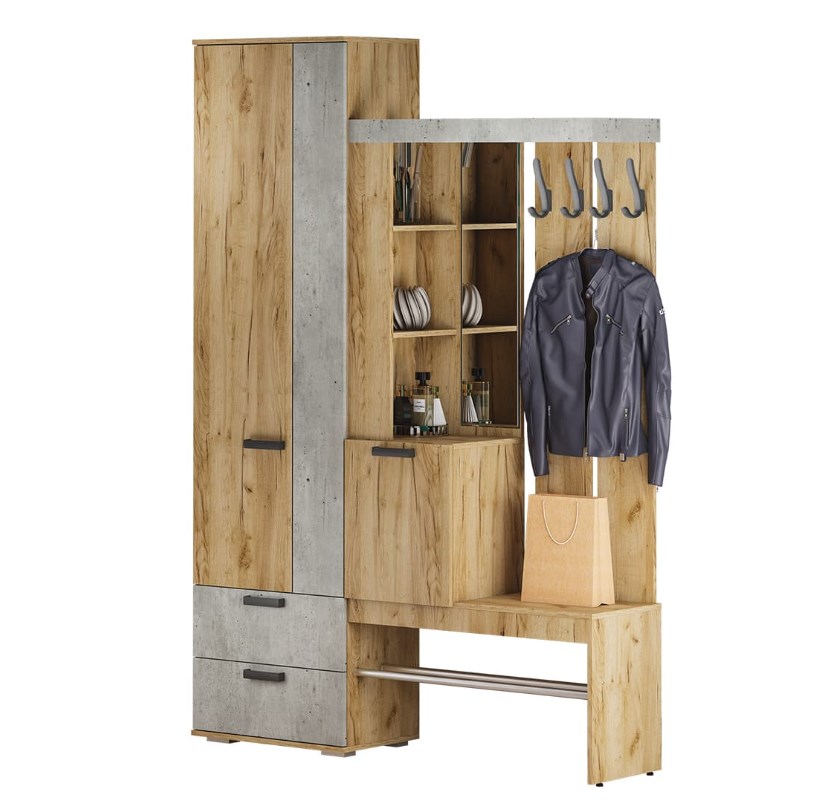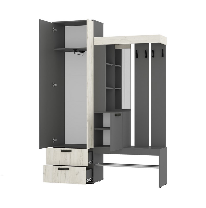 Практичная конструкция. Вместительный и компактный шкаф с отделением для верхней одежды и выдвижными ящиками. Удобная подставка под обувь (металлическая труба). Эргономичная основная секция с крючками для одежды, полками для мелочей, зеркалом и одним закрытым отделением. Контрастное исполнение в трендовых оттенках.