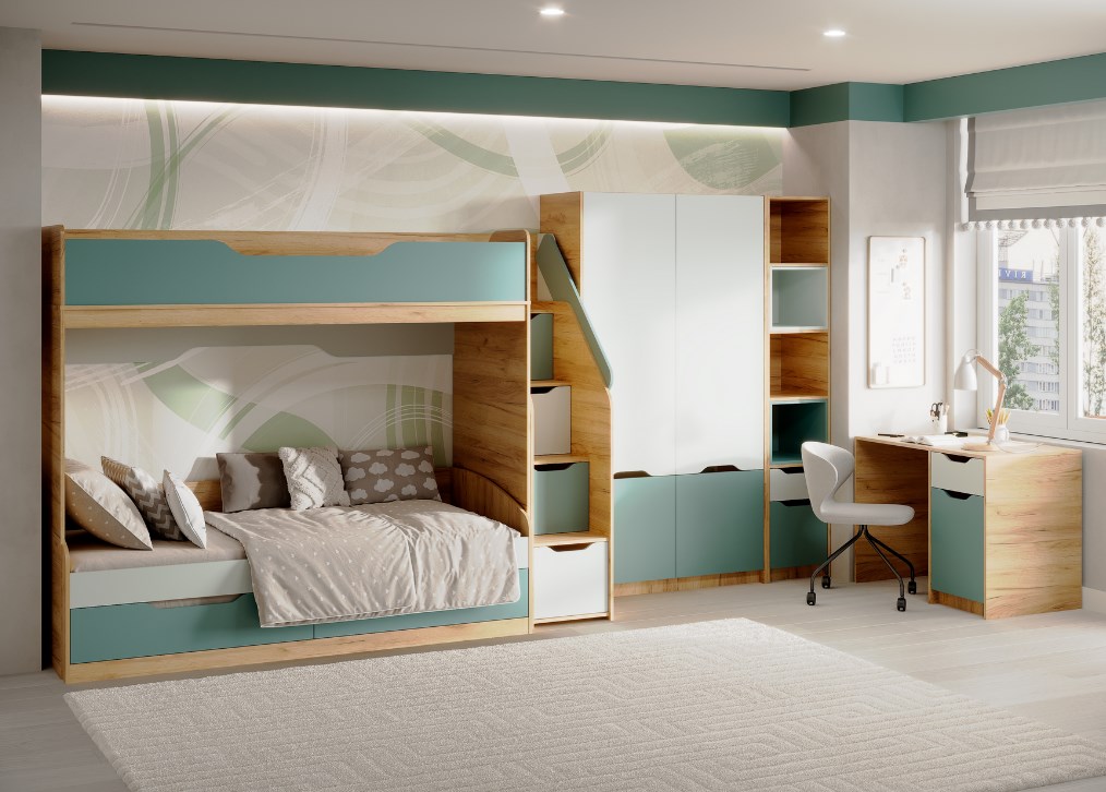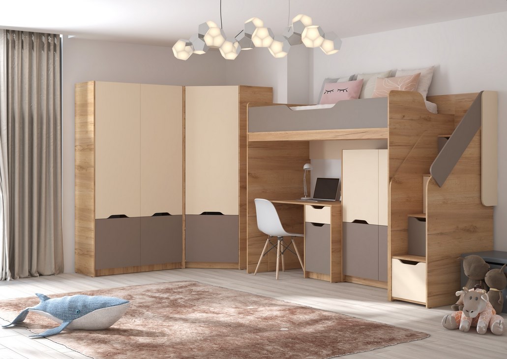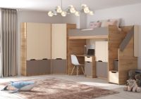 Модульная система. Размер кровати-чердак: (Г*Д*В) 876*2528*1810, спальное место: 800*2000. Кровать-тахта: (Г*Д*В) 940*2032*650, спальное место: 900*2000. Цвет: корпус - Дуб Крафт золотой / фасады - «Пастельный зеленый + Сумеречный голубой» или «Миндаль + Глиняный серый».