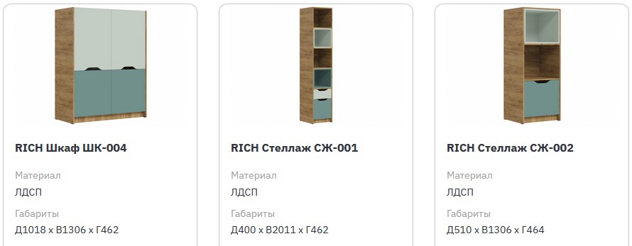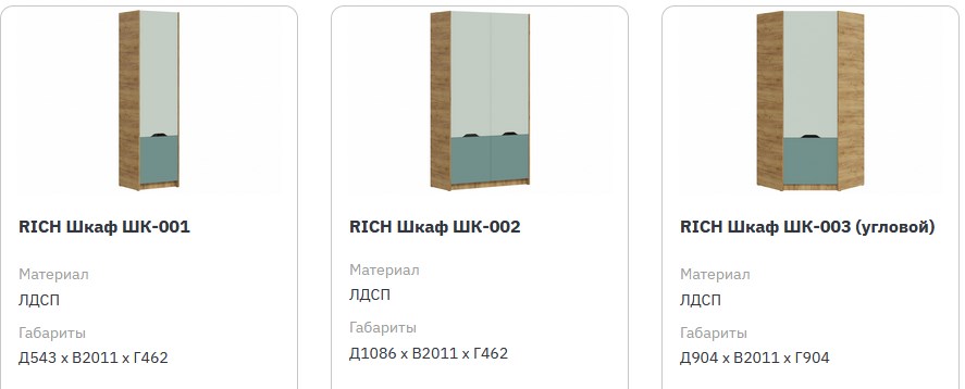 - RICH Шкаф ШК-002 (шкаф 2х ств. с полками и штангой): (Ш*В*Г) 1086*2011*462;