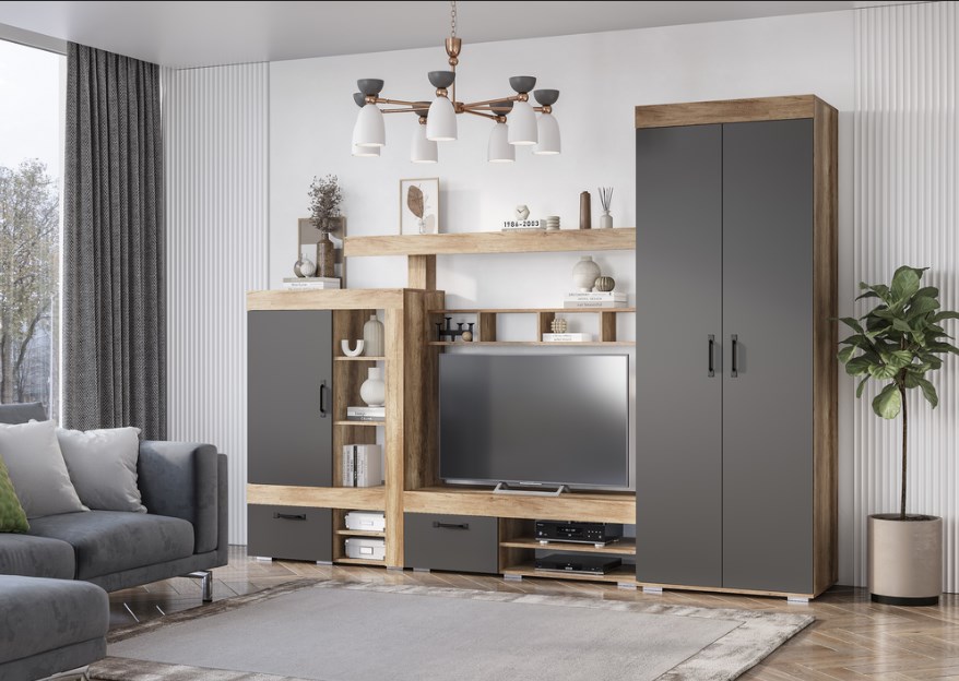 Модульная система. Размер: (Ш*В*Г) 2904*2176*460/510. Ниша под ТВ (Ш*В) 1200*810. Цвет: графит / дуб каньон.
